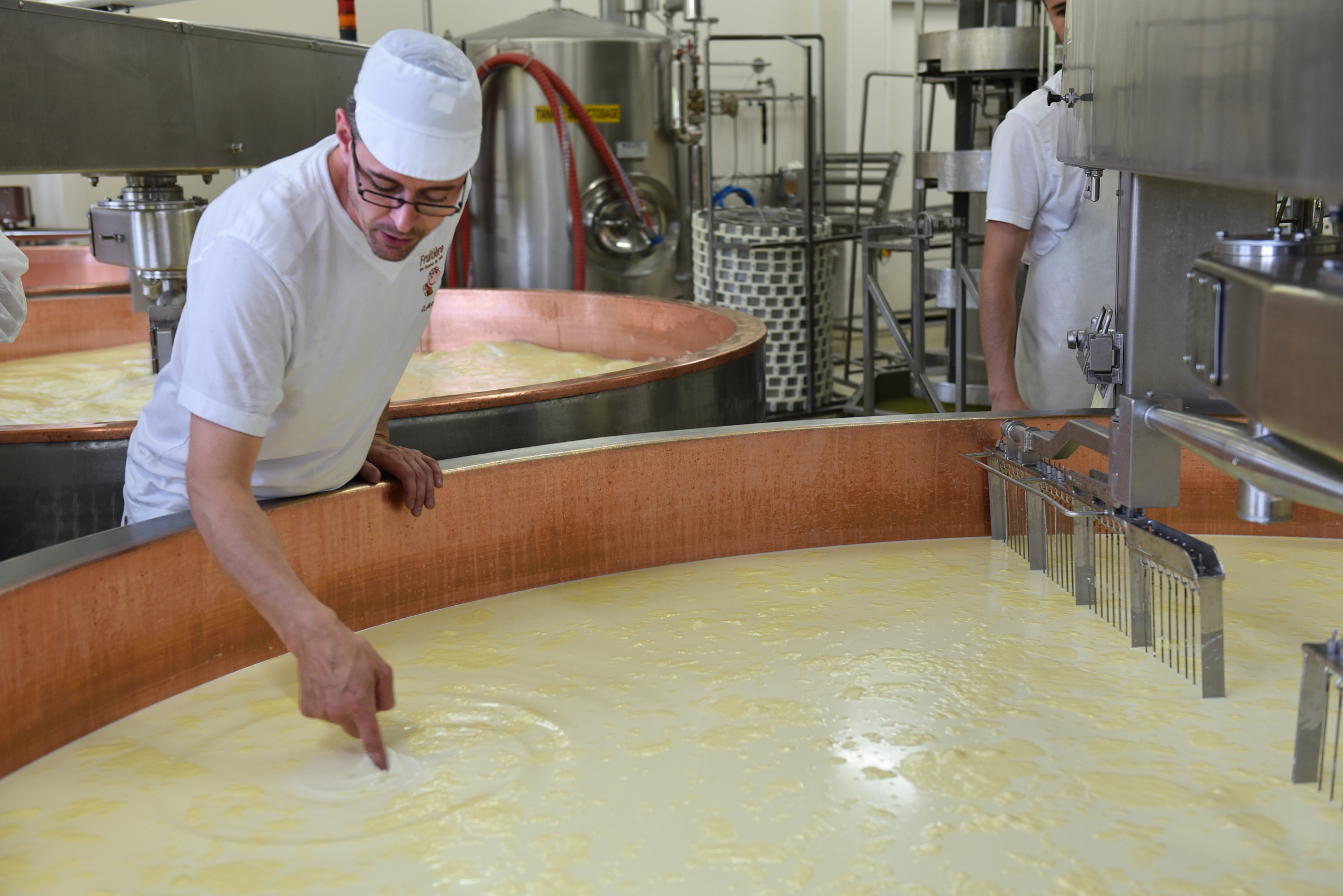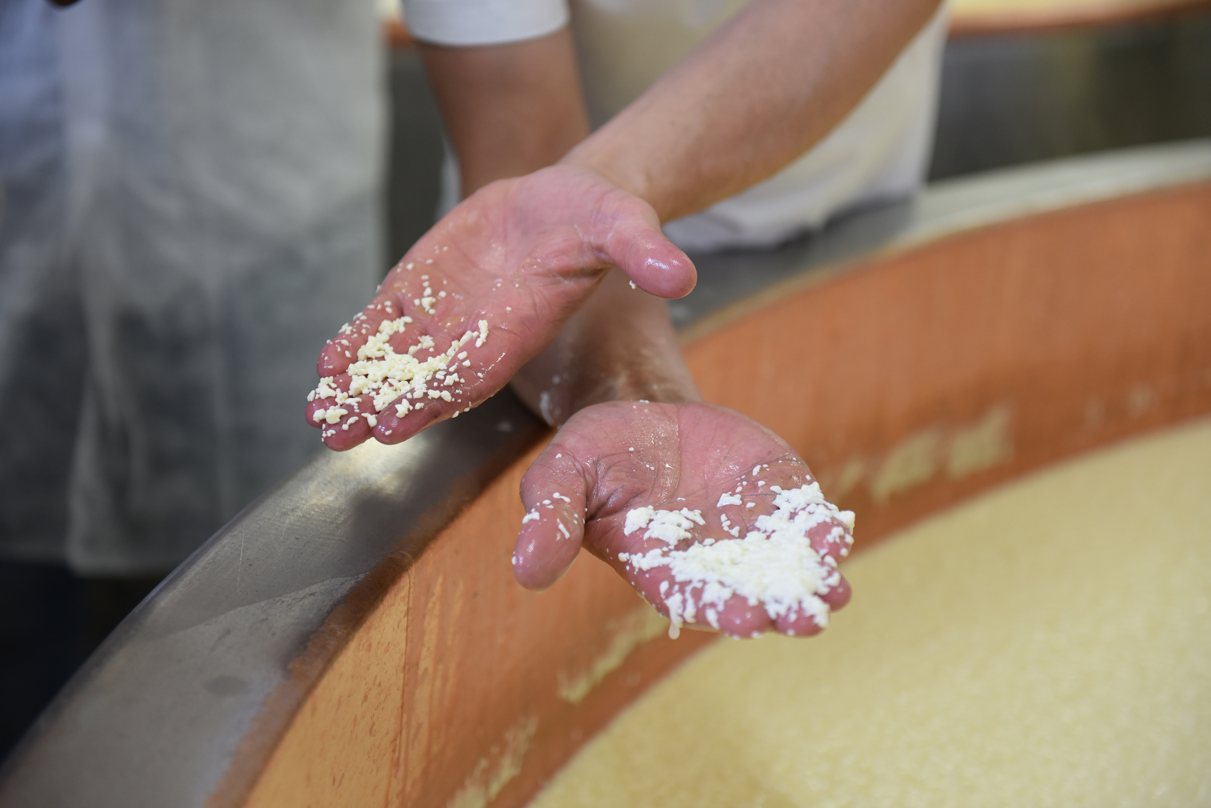 “Als de melk een temperatuur bereikt van 30°C, doet het stremsel – afkomstig uit de maag van kalfjes – zijn werk. Er worden vlokken gevormd, de wrongel.” Af en toe gaat Anthony met zijn hand door de melk en haalt telkens enkele, steeds groter wordende, vlokken naar boven. Zodra de vlokken voldoende groot zijn, vervangt zijn assistent de ronddraaiende roerbladen door een soort verticale snijmessen. “Dit voorkomt dat de wrongel nog kan samenklonteren.”