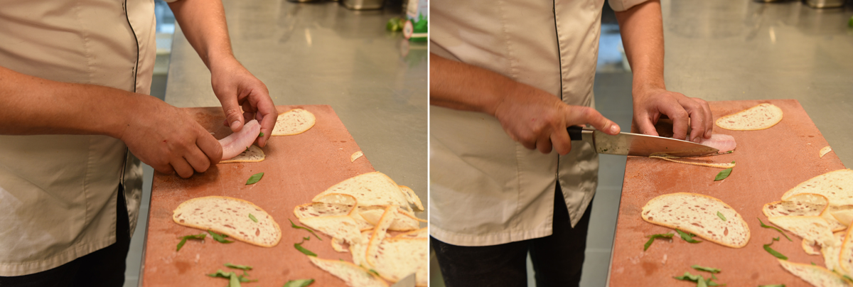– Smeer de filets in met eiwit – om het brood vast te houden – en beleg deze dan met de basilicum reepjes. Leg de filets op de broodplakjes en snijd met een scherp mes langs de de filets. Bewaar met het brood naar boven in de frigo.