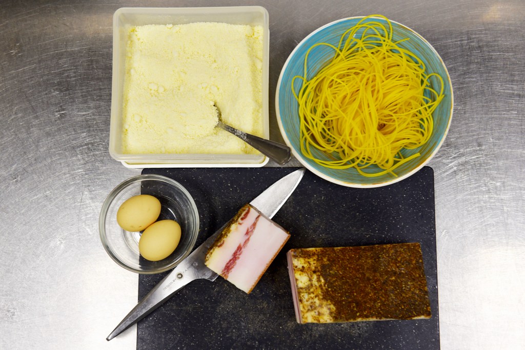 – Zet een pan met ruim water en een snuifje zout op en breng aan de kook. Inderdaad dit keer weinig zout in het kookwater van de pasta, want guanciale én pecorino zijn al zout.