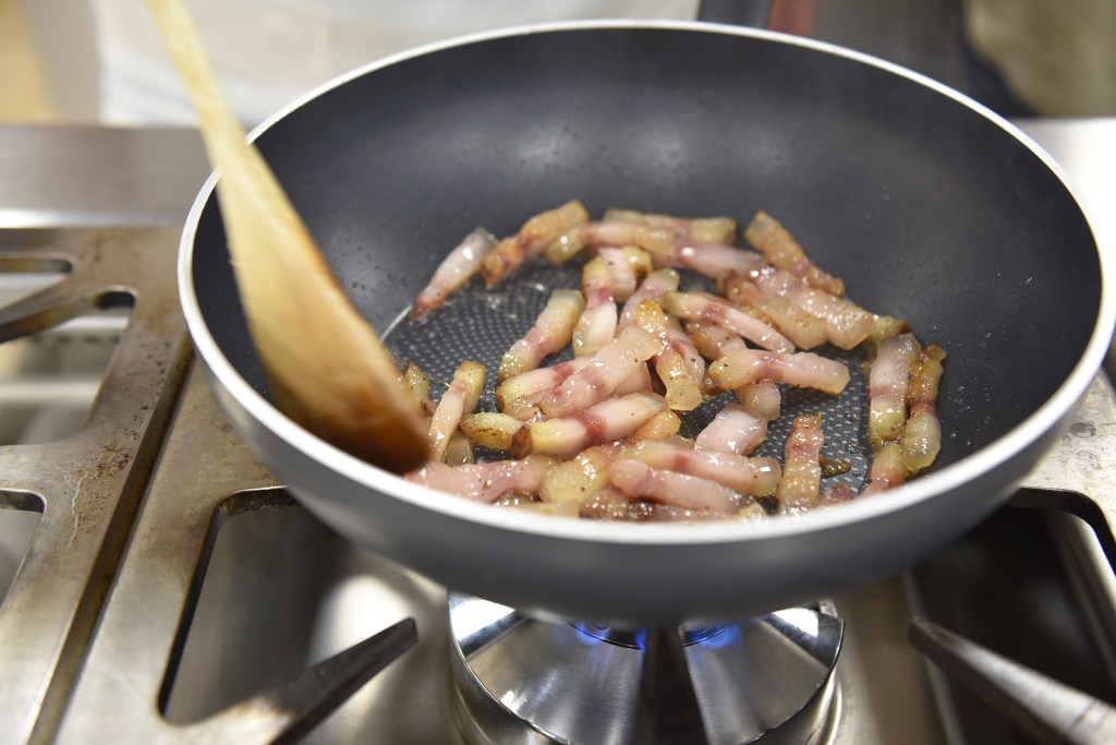 – Doe de guanciale in een koude bakpan, plaats op het vuur en zet dit nu pas aan. Laat op een zacht vuur bakken tot glazig. Zo vind ik dat het lekkerst, hou jij van meer krokant, laat dan rustig verder bakken.