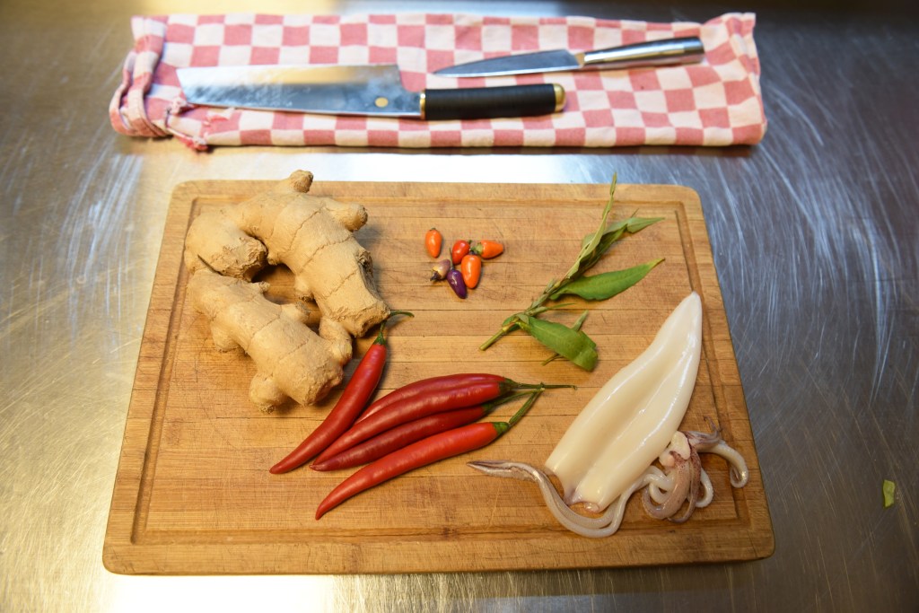 – Rau ram ofte Vietnamese koriander, is een groen kruid met spitse blaadjes en een wat bittere smaak. Gebruik er voldoende van voor een goed contrast tussen het zoete van de vissausvinaigrette, het sterke en pikante van de gember en de pepers en het zachtzoete van de inktvis.