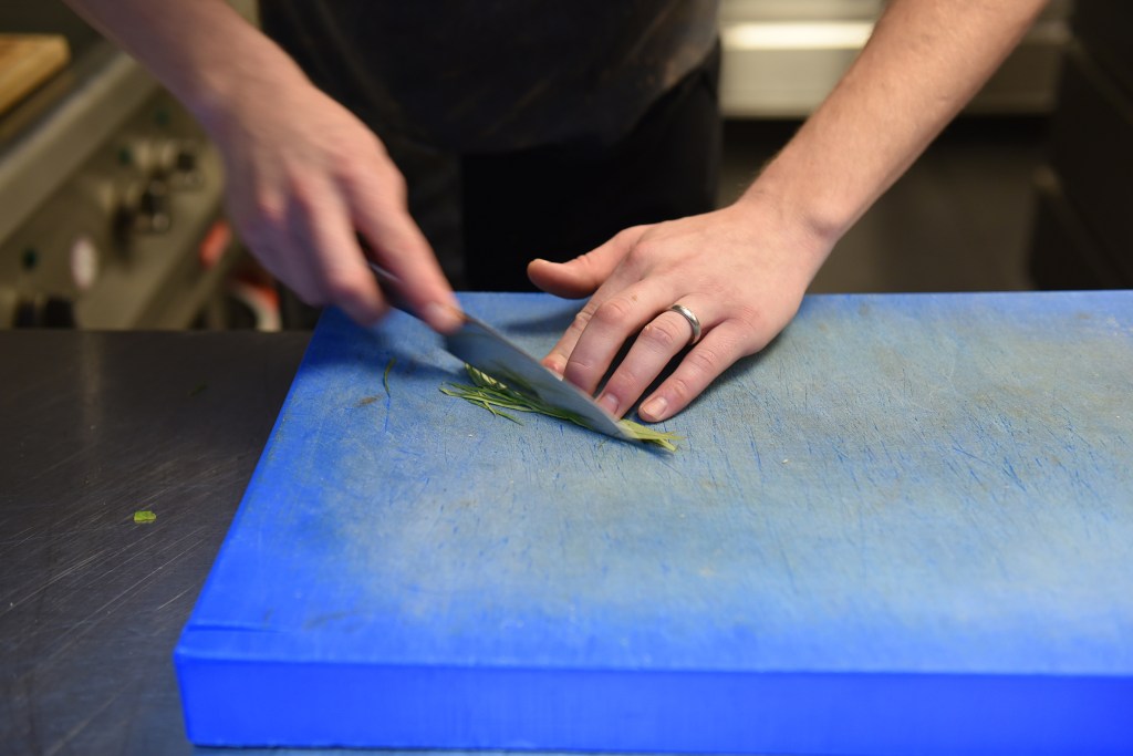 – Mooie ringen snij je door de vis met de rugkant naar boven te leggen en tijdens het snijden zachtjes plat te duwen.