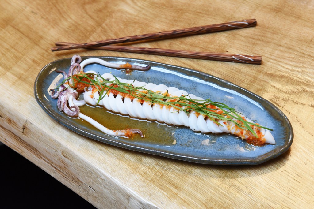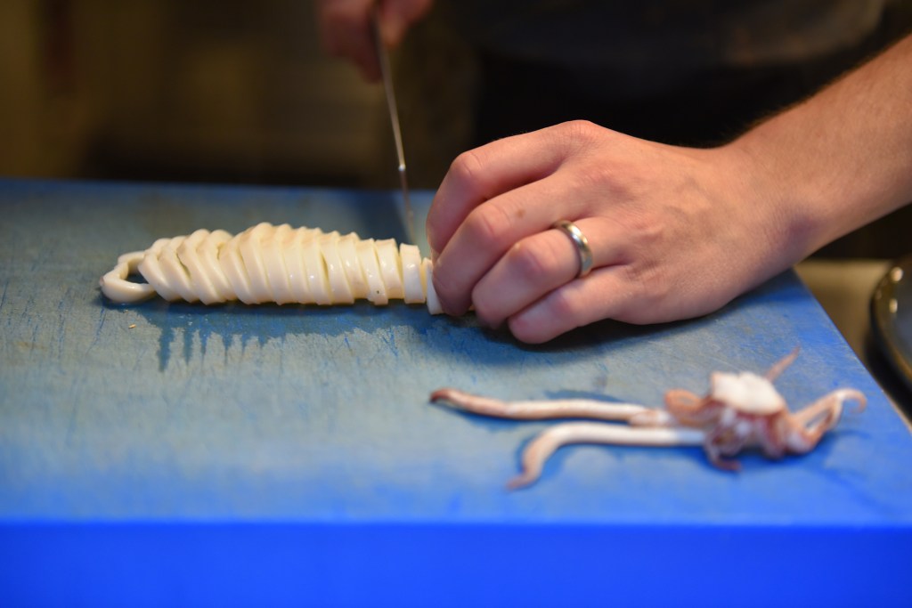 – Pijlstaartinktvis is een kleine inktvis die veel in Azië gebruikt wordt, maar ook in de Noordzee zwemt. Koop verse volledige pijlstaarten van 100 g/stuk, daar hou je netto 60 g aan over.