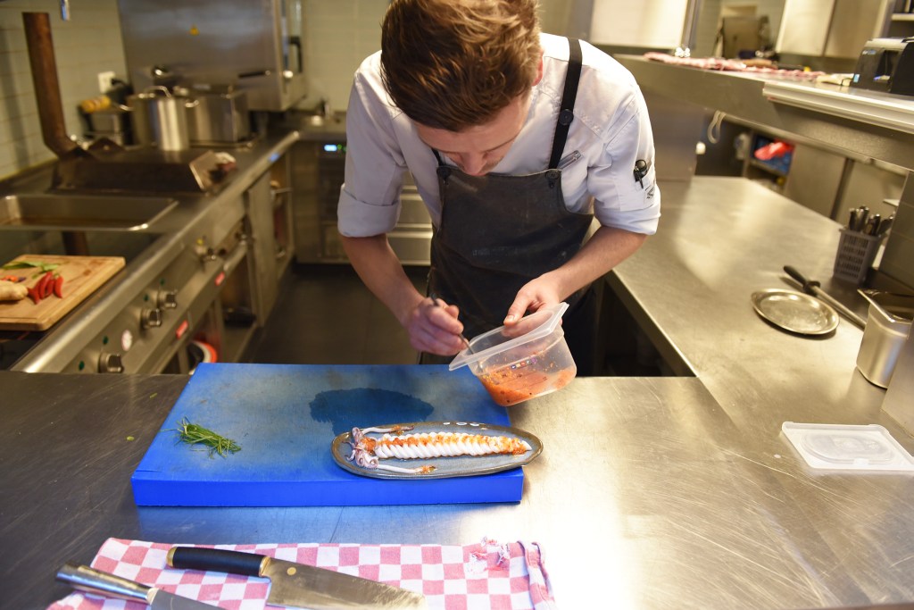 – Maak de vissen schoon (of laat dit bij aankoop doen door de visboer) en dompel de lijfjes en tentakels 1 minuut in kokend water. Neem uit, dep droog en snij de lijfjes in ringen. Leg ze mooi naast elkaar op een bord, overgiet met de saus en bestrooi royaal met rau ram.