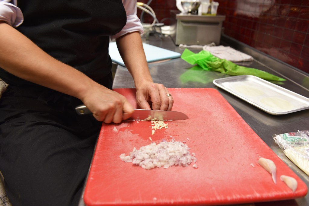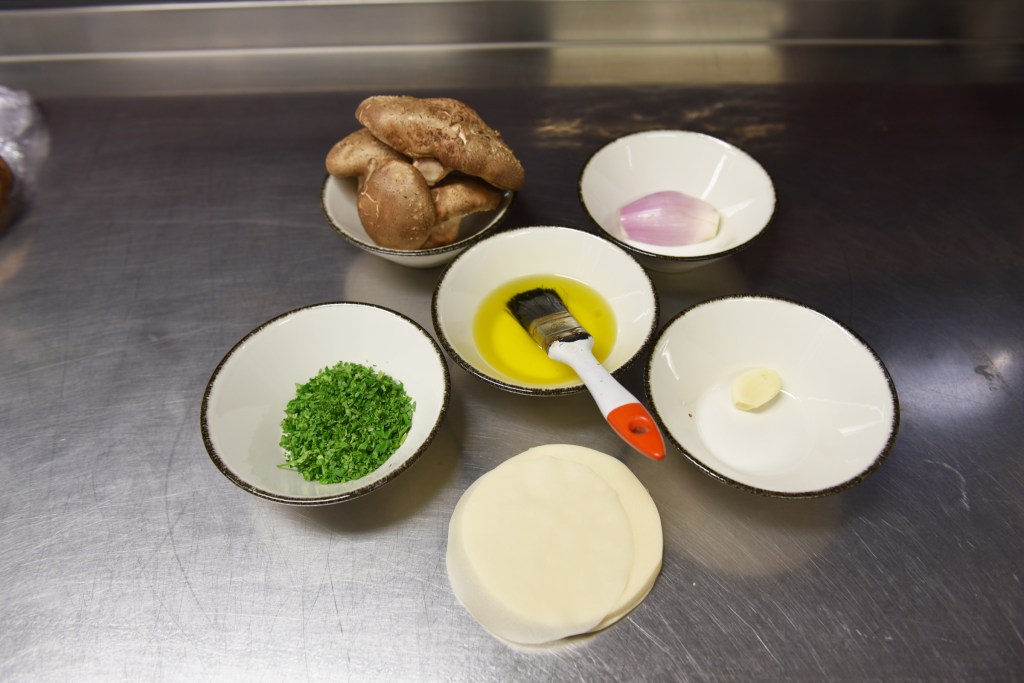 – Cutter voor de duxelle de steeltjes en bak samen met de sjalotten aan in wat olie met fijngesnipperde look. Laat sudderen tot het vocht weg is en zet opzij.