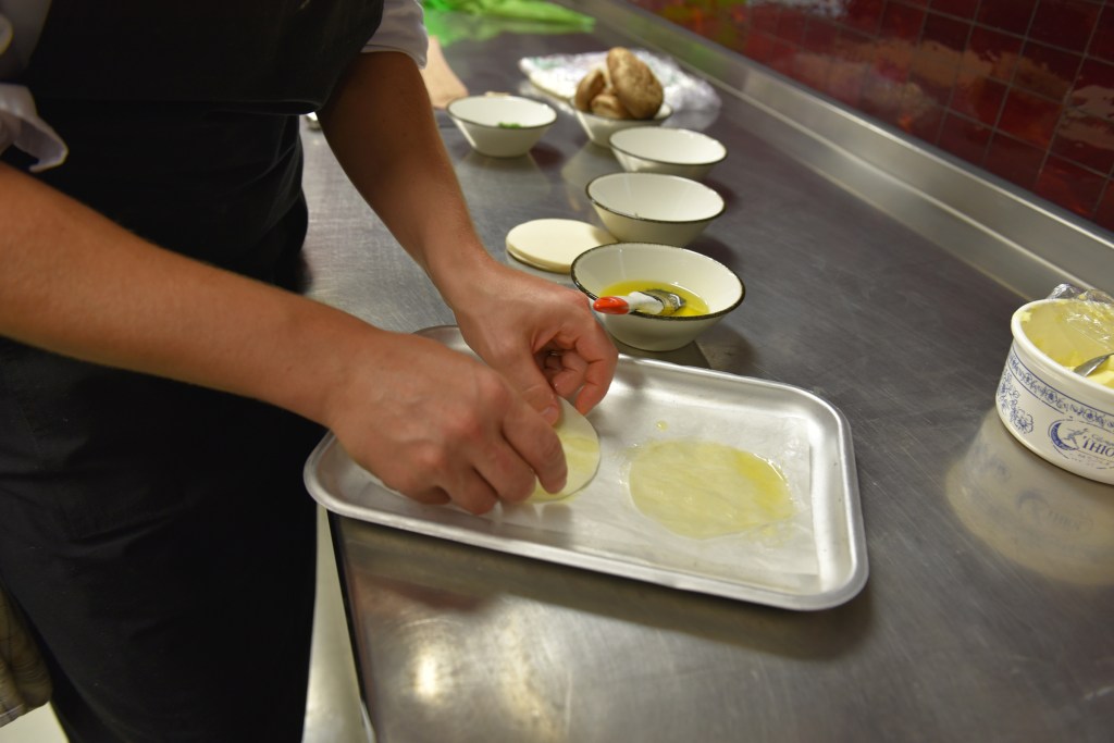 – Leg streepjes duxelle met wat tussenruimte over de bovenste velletjes en duw wat plat, zorg dat er tussenruimte blijft. Beleg dakpansgewijs met de shii-takeplakjes zodat de vellen niet meer zichtbaar zijn. Zet een uur in de diepvries, haal uit en bak 7 min. in een voorverwarmde oven op 200°C. Neem uit en leg de taartjes met het bakpapier in een bakpan en bak nog even op hoog vuur zodat de bodem stevig wordt.