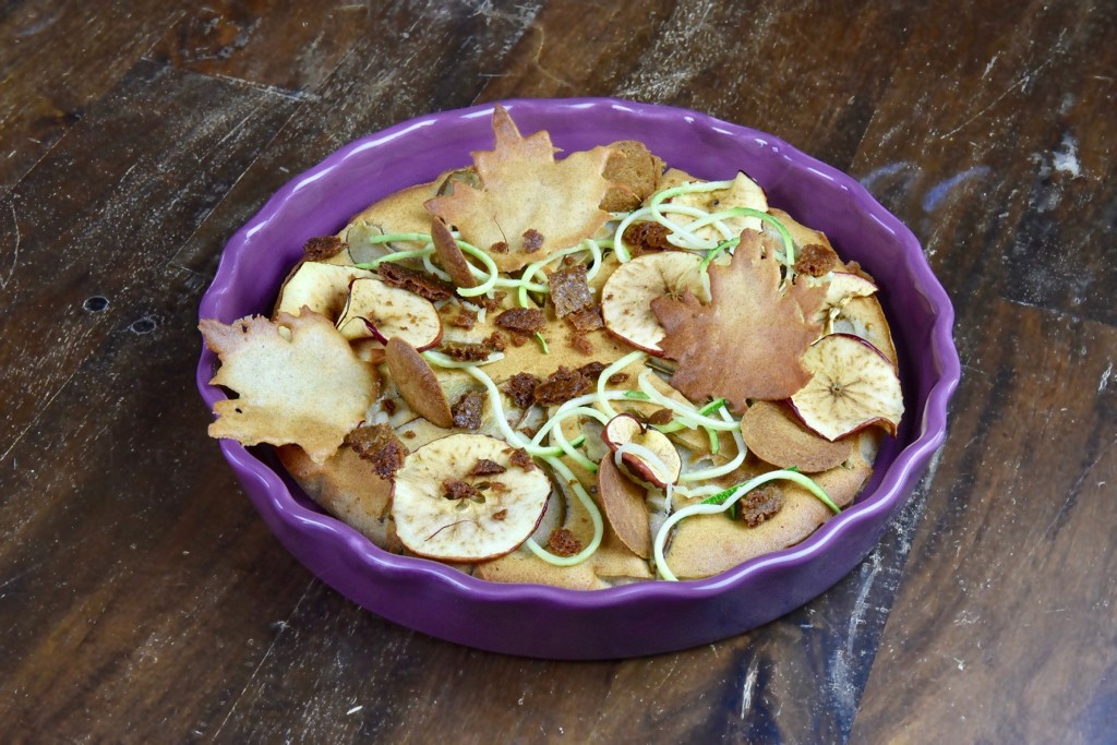 – Misschien niet ‘gewoon’ en geen must, maar courgetteslierten zijn een speels extraatje die kleur brengen en een frisse toets geven aan de taart. Hou je het liever helemaal herfstig verdeel er dan stukjes walnoot over, die zijn er nu ook volop.