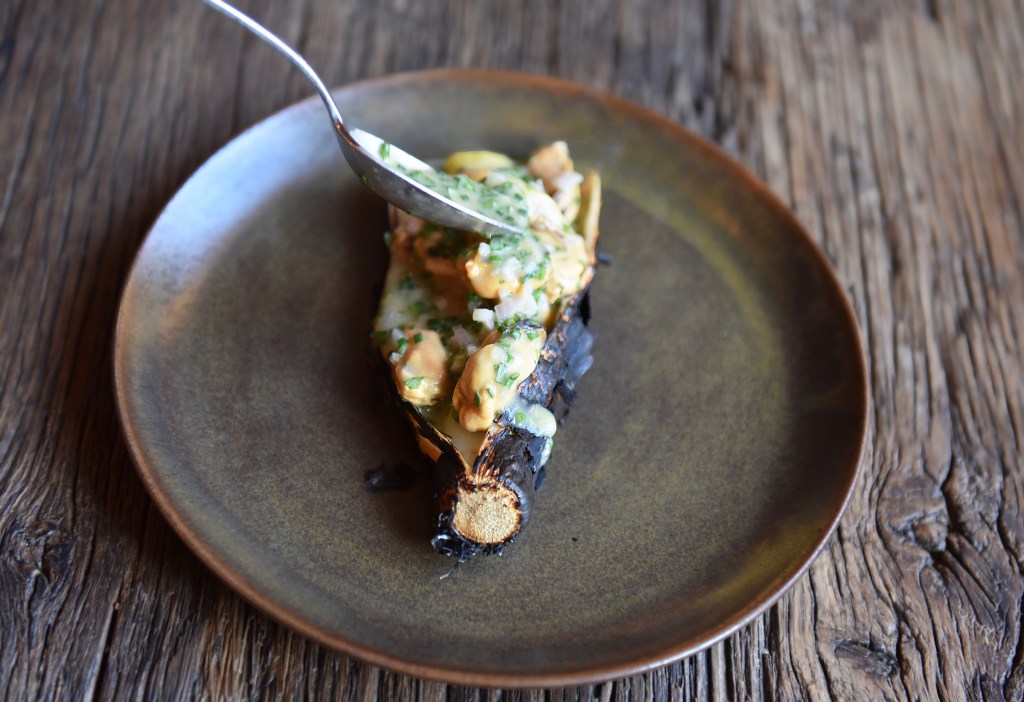– Open de gegrilde preien en lepel de mosselsaus over de stukjes wit.