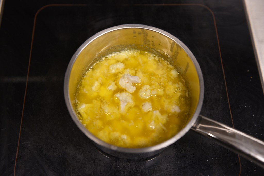 – Zet de bloemkoolroosjes onder in gesmolten boter en gaar ze op een zacht vuurtje. Giet de roosjes af door een zeef (bewaar de boter) en kleur de roosjes bruin en krokant onder de ovengrill.
