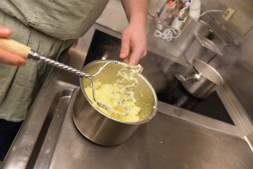 – Kook de aardappelen in gezouten water, giet af, laat even uitdampen en prak fijn met een pureestamper. Voeg een scheutje karnemelk en wat van de bloemkoolboter toe en meng goed. De puree mag best nog stevig zijn, je kunt steeds extra karnemelk en boter toevoegen. Doe er sjalot en bieslook bij naar eigen smaak, proef en breng verder op smaak met zout en zeste van citroen.