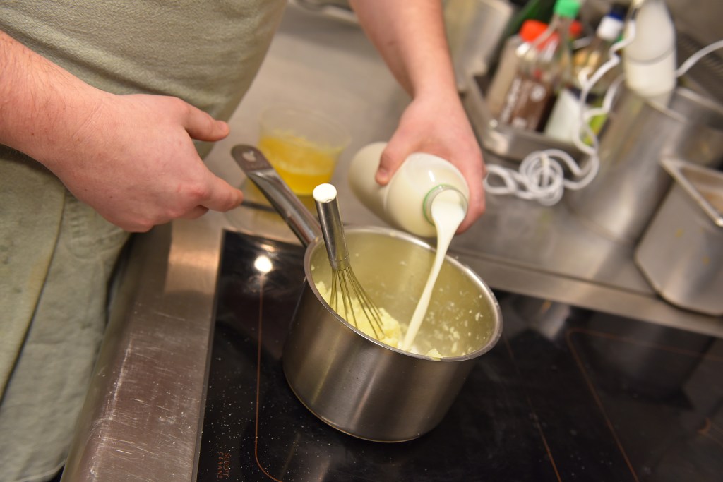 Chef Gregory Schatteman van Restaurant Schatteman in Hertsberge: “’Karnemelksmeus’ is een typisch gerecht van de vissersvrouwen. Aardappelen hadden ze meestal in hun kleine moestuin, eitjes van hun kippen en karnemelk was spotgoedkoop. De garnalen gingen ze zelf ‘scheppen’ op het strand. Dus eigenlijk was het een armeluis gerechtje, maar wel eentje boordevol smaak!”