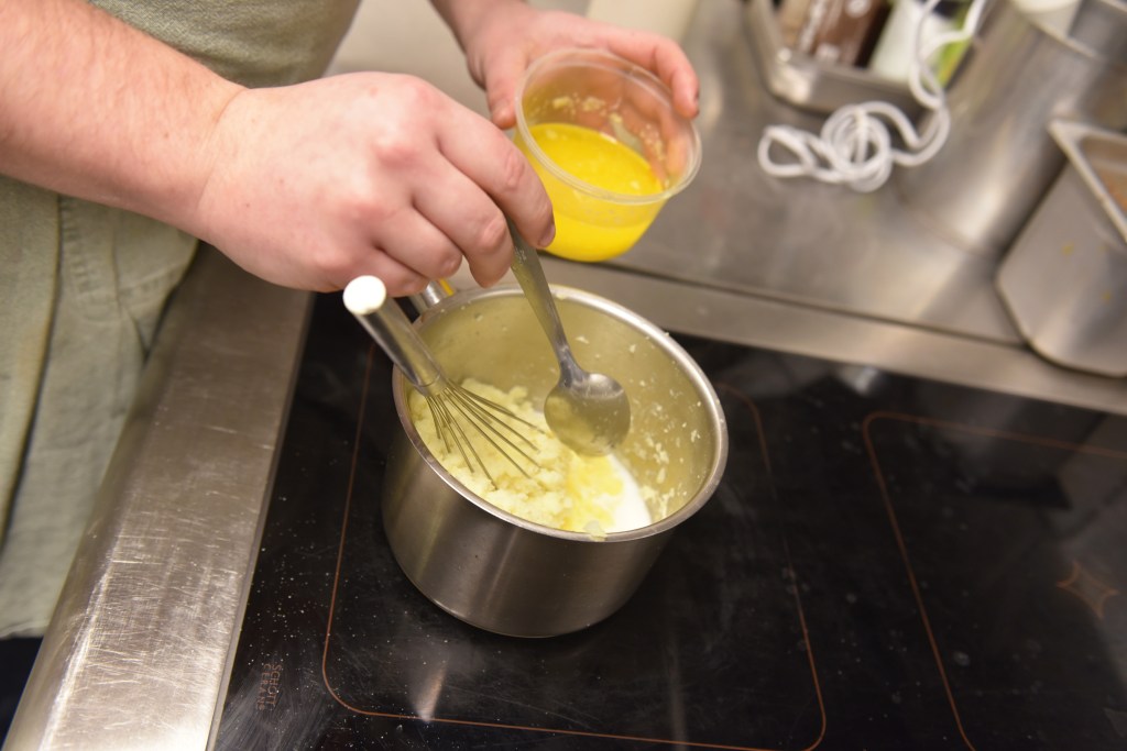 – Neem je eitjes vooraf uit de frigo en laat ze op kamertemperatuur komen om te vermijden dat ze barsten tijdens het koken. Het gekookte eitje kun je ook vervangen door een spiegelei.