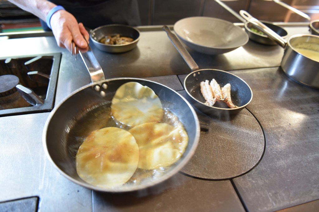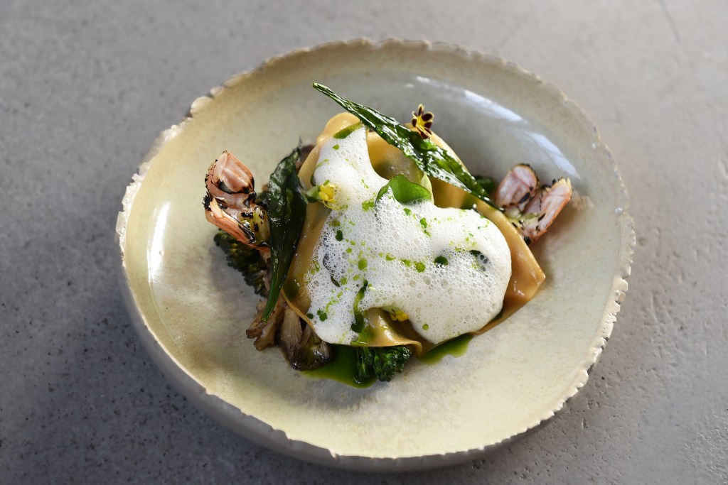 Schik de bimi en maitake in een diep bord samen met de langoustines/vis. Drapeer er een pastacirkel over en garneer met krokante daslook en eventueel bloemetjes en kruiden. Werk af met opgeschuimde witte wijnsaus en daslookolie.