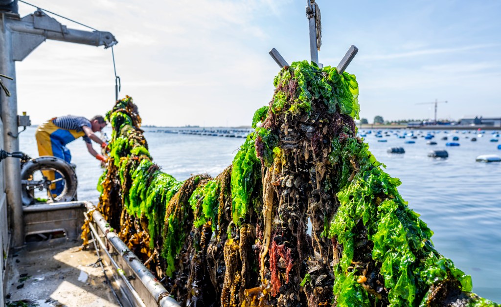“De mosselen zijn al ongelofelijk goed gevuld, dat is opmerkelijk voor deze tijd van het jaar. De vele zonuren van de afgelopen weken hebben effect gehad”, legt hangcultuurkweker Jan Bout uit aan boord van de BRU49. De kwekers mogen hun hangcultuurmosselen dit jaar voor het eerst ook officieel biologisch noemen