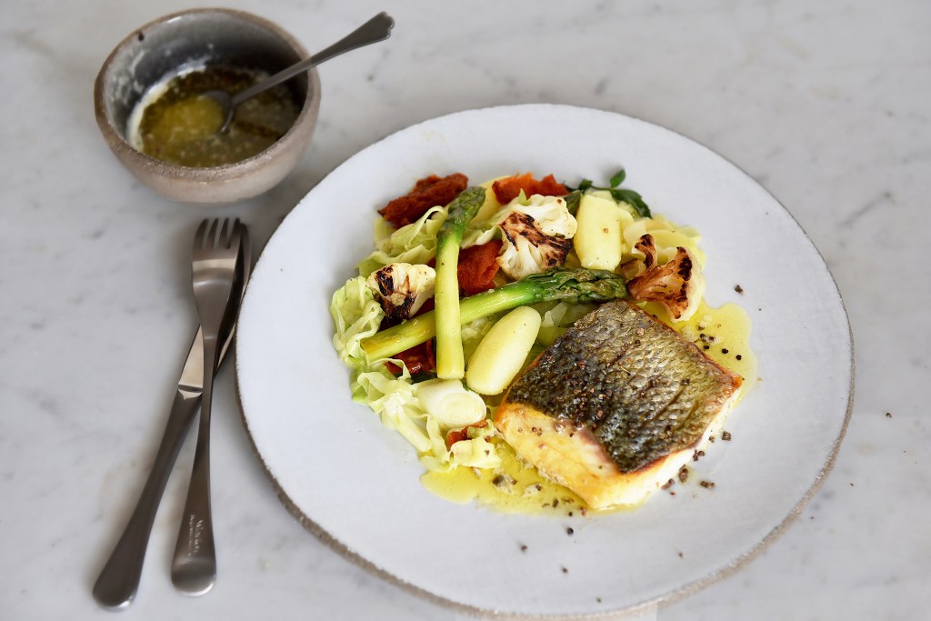 Zeebaars met jonge groentjes en kapperbloesemboter
