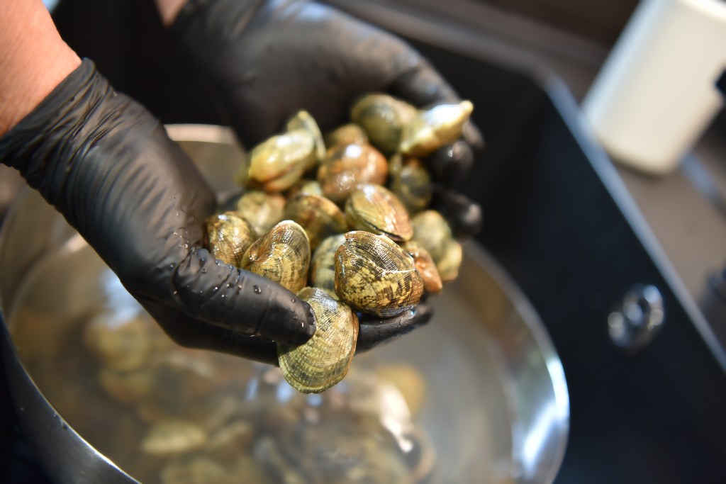 Week de venusschelpen in koud water met een handvol grof zout om ze van eventueel zand te zuiveren.