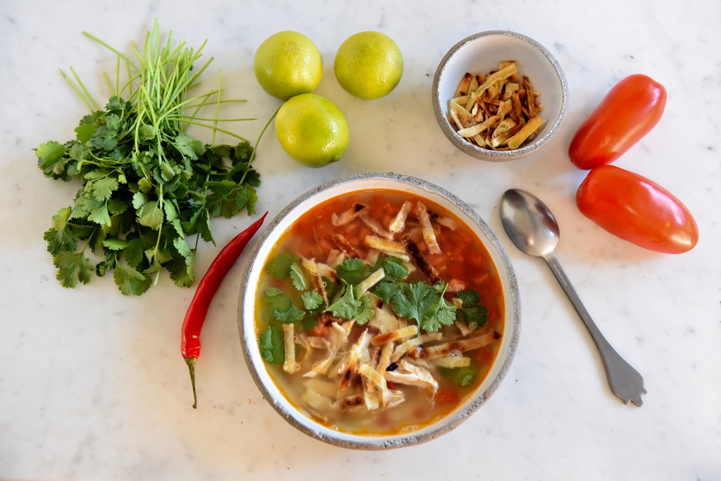 Verfris de soep vlak voor overscheppen in kommetjes of diepe borden, met limoensap en werk de borden af met de tortillareepjes en korianderblaadjes.