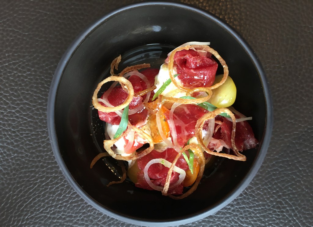 Afwerking: verdeel de tomaatjes over kommetjes, zet er dotjes pesto tussen, verdeel er de burratavlokjes over, leg er plakjes vlees op en bedruppel met vinaigrette. Werk eventueel verder af met zoetzure en krokante sjalotringen.