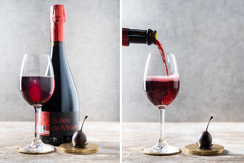 Het resultaat is een unieke, frisse en fruitige rode wijn. Uitstekend om te serveren als aperitief, maar de Bulles de Minière rouge is ook lekker als cocktail of bij een dessert met chocolade en/of rood fruit. De wijn behoudt zijn zachte tannines waardoor deze Bulles de Minière ook bij een vleesgerecht kan geserveerd worden. athleen geeft graag een persoonlijke smaaktip mee: fijnproevers zullen de frisse wijn met aroma’s van morello kersen in combinatie met een cerisette (of twee, drie..) zeker weten te appreciëren.