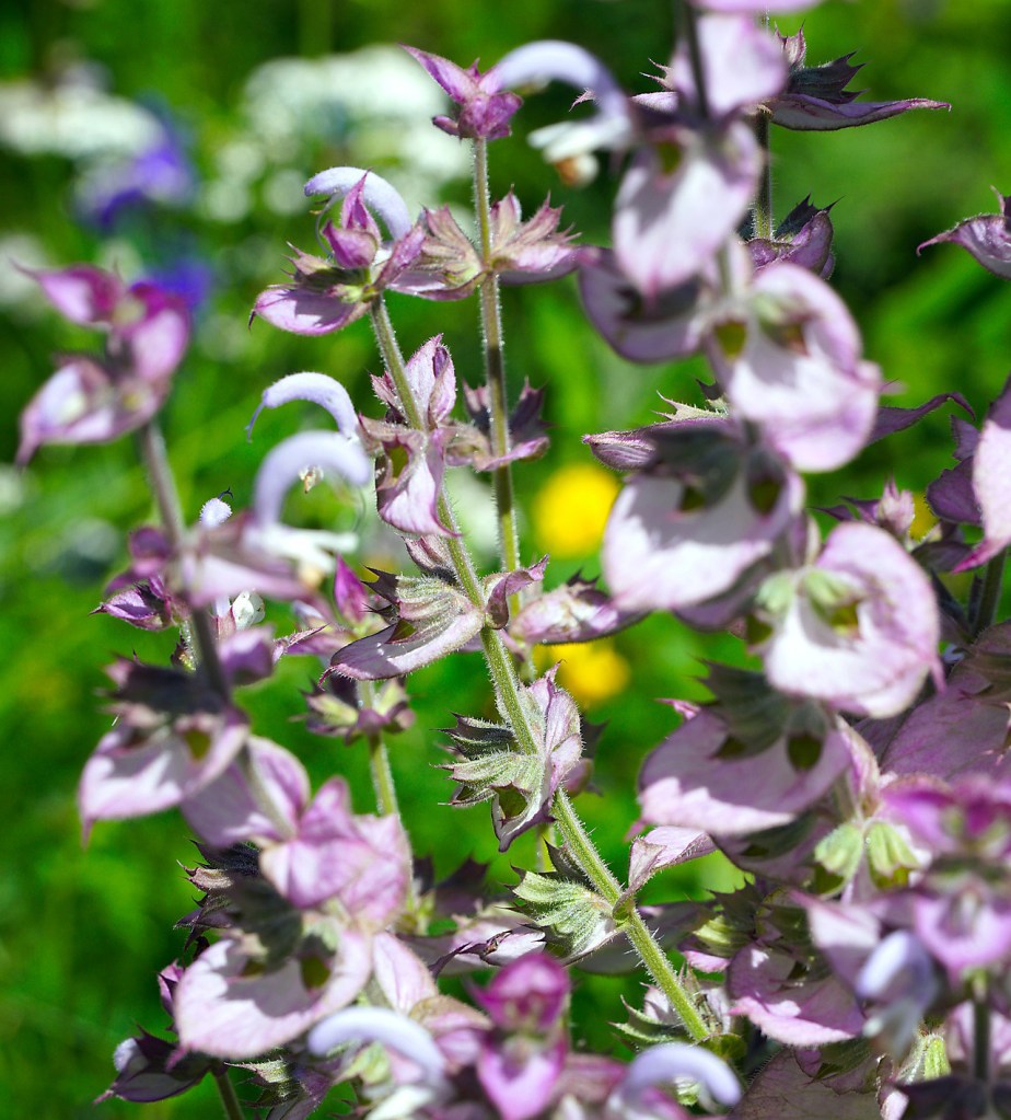 “Een wondere plant die rijkelijk bloeit met bloemen van soms 1,5 cm groot in een schakering van lila. Muskaatsalie kan makkelijk tot 2 m hoog worden met bladeren zo groot als die van rabarber. Ze heeft de meest complexe geur van alle salies: een verleidelijk aardse, kruidige geur met toetsen van bergamot, citronel, geranium en oranjebloesem. Ze wordt dan ook vaak in parfums gebruikt. Muskaatsalie is niet zo makkelijk te vinden, je moet er echt naar op zoek. Een tijd geleden heb ik een flinke hoeveelheid kunnen plukken bij De Kruiderie in Beernem. Ik infuseer de bloemen in melk en maak daarvan roomijs, heel lekker in combinatie met cassis en vlierbes.”